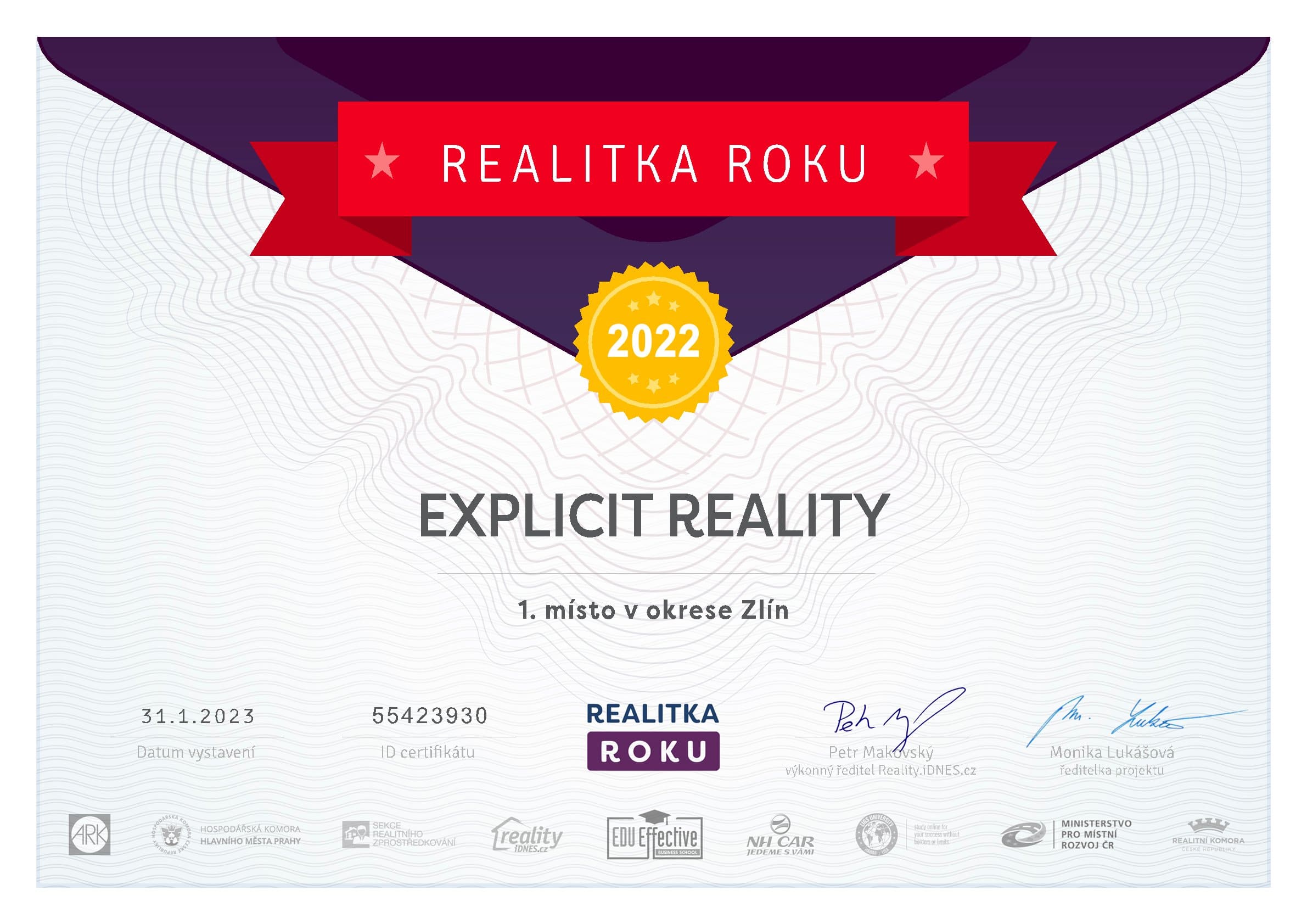 Vyhráli jsme již podruhé za sebou ocenění Realitka roku za rok 2022 v okrese Zlín.
