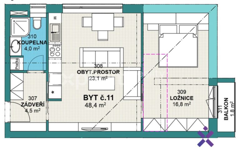 Jedná se o byt 2+kk o výměře 48 m² ve 3.nadzemním podlaží. K bytu náleží sklepní kóje o velikosti 11,7 m² a jedno parkovací místo přímo před domem.