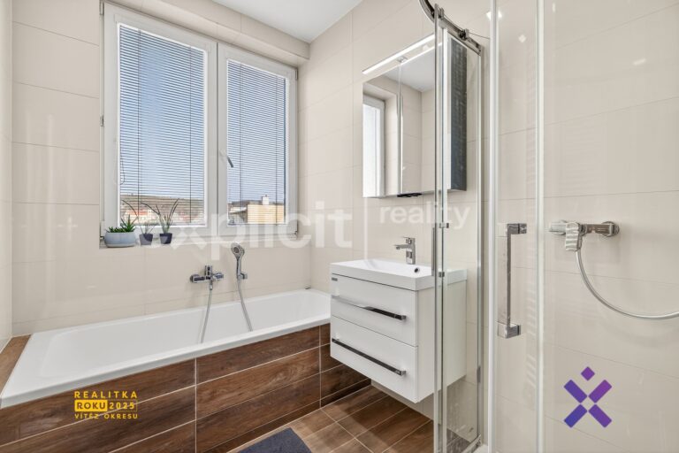 Naproti ložnici a dětskému pokoji je koupelna s vanou, sprchovým koutem a topným žebříkem. Díky světlému obkladu kombinovanému s dekorem dřeva a přítomnosti okna působí prostor vzdušně a prosvětleně. Samostatné WC je umístěno vedle koupelny.