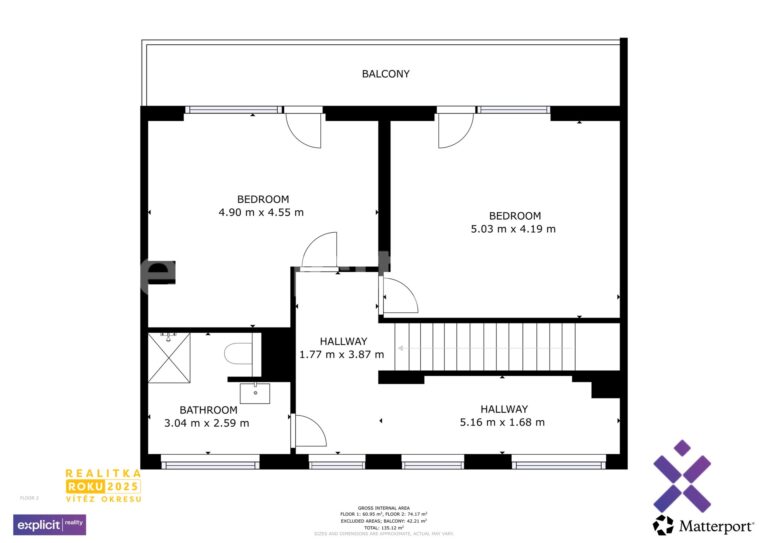 Z horní chodby je vstup do dvou prostorných pokojů, které mají přímý vstup na terasu. Místnosti lze využít jako ložnici, dětský pokoj nebo pracovnu. Na tomto podlaží je druhá koupelna se sprchovým koutem, topným žebříkem a toaletou. Dále se zde nachází prostor s přípojkou pro pračku, což umožňuje praktické a nenápadné řešení domácího zázemí. Celý byt je vytápěn podlahovým topením.