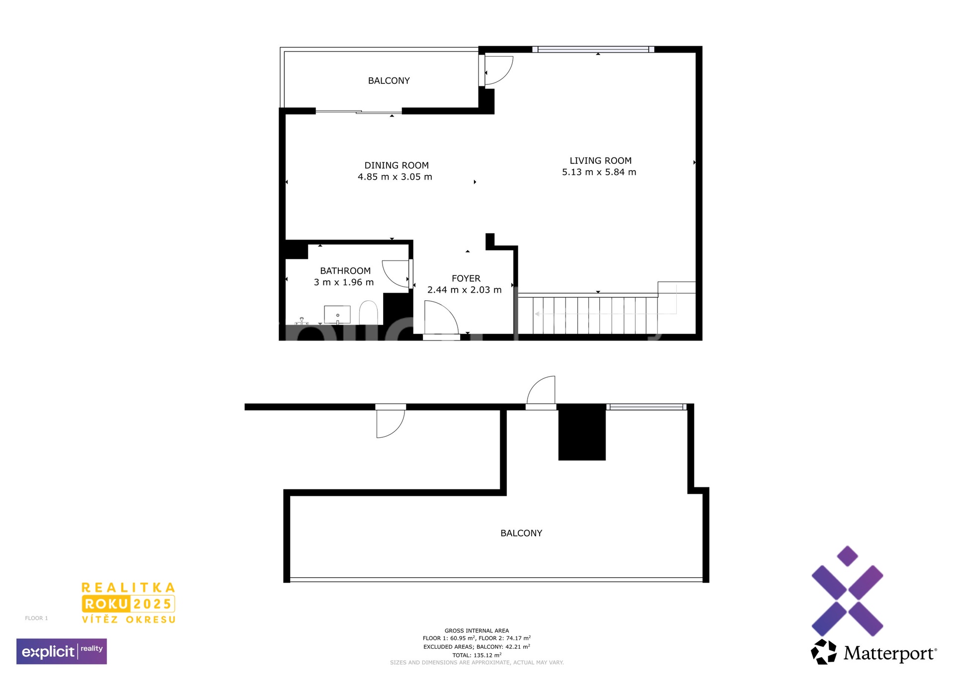 Hlavní obytný prostor tvoří velká otevřená místnost, ideální pro kuchyňský kout s jídelnou a obývací částí. Díky dvěma francouzským oknům je místnost nádherně prosvětlená a působí velmi vzdušně. Tato okna zároveň slouží jako vstup na spodní terasu, která rozšiřuje obytný prostor a nabízí místo k odpočinku. Obě patra spojuje stylové dřevěné schodiště.