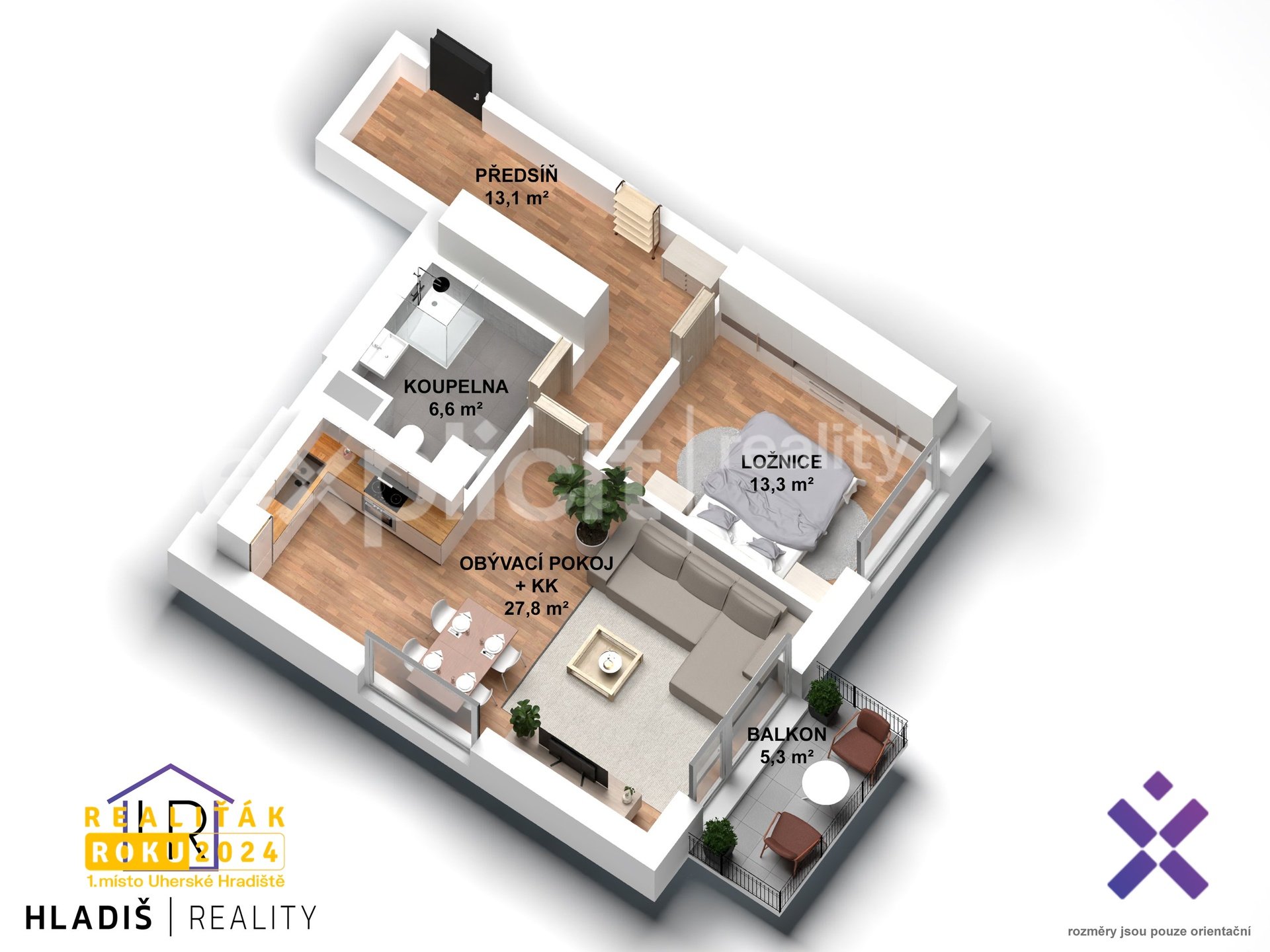 – obývací pokoj s kuchyňským koutem, oddělenou ložnicí, předsíň, koupelnu s WC, balkon a samostatný sklep v 1. NP