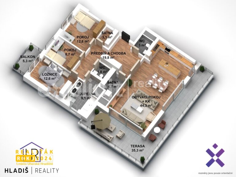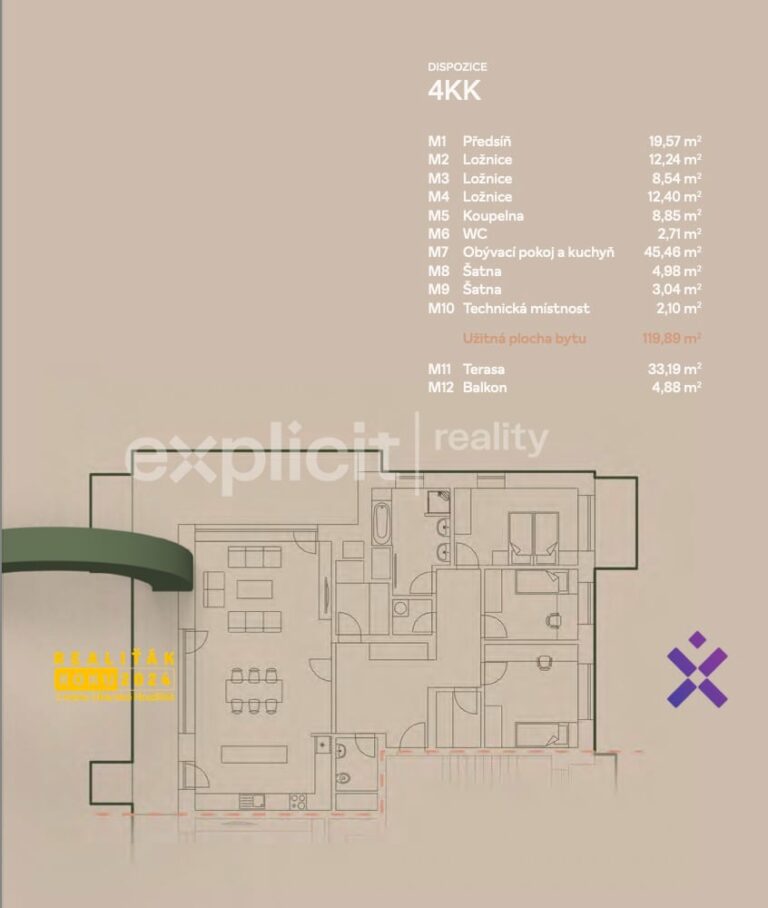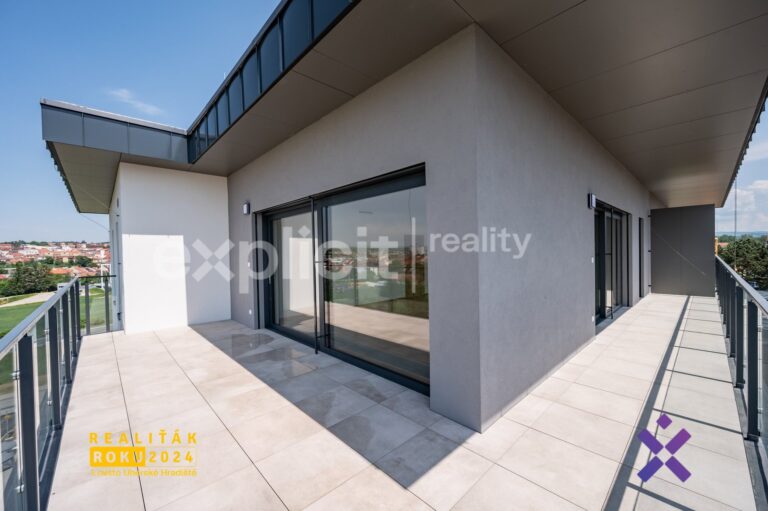 – velkorysý obývací pokoj s kuchyňským koutem s plochou 50 m² a třemi ložnicemi, k bytu patří i luxusní střešní terasa o výměře přes 40 m², součástí jsou taky dvě šatny, technická místnost a předsíň