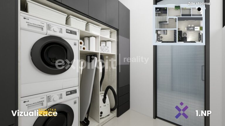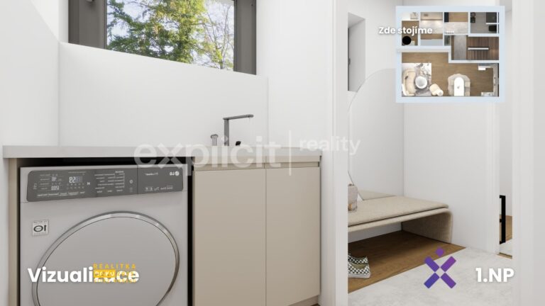 – každý dům má samostatné technické zázemí (pro pračku i sušičku), plynový kotel, rekuperaci i retenční nádrž