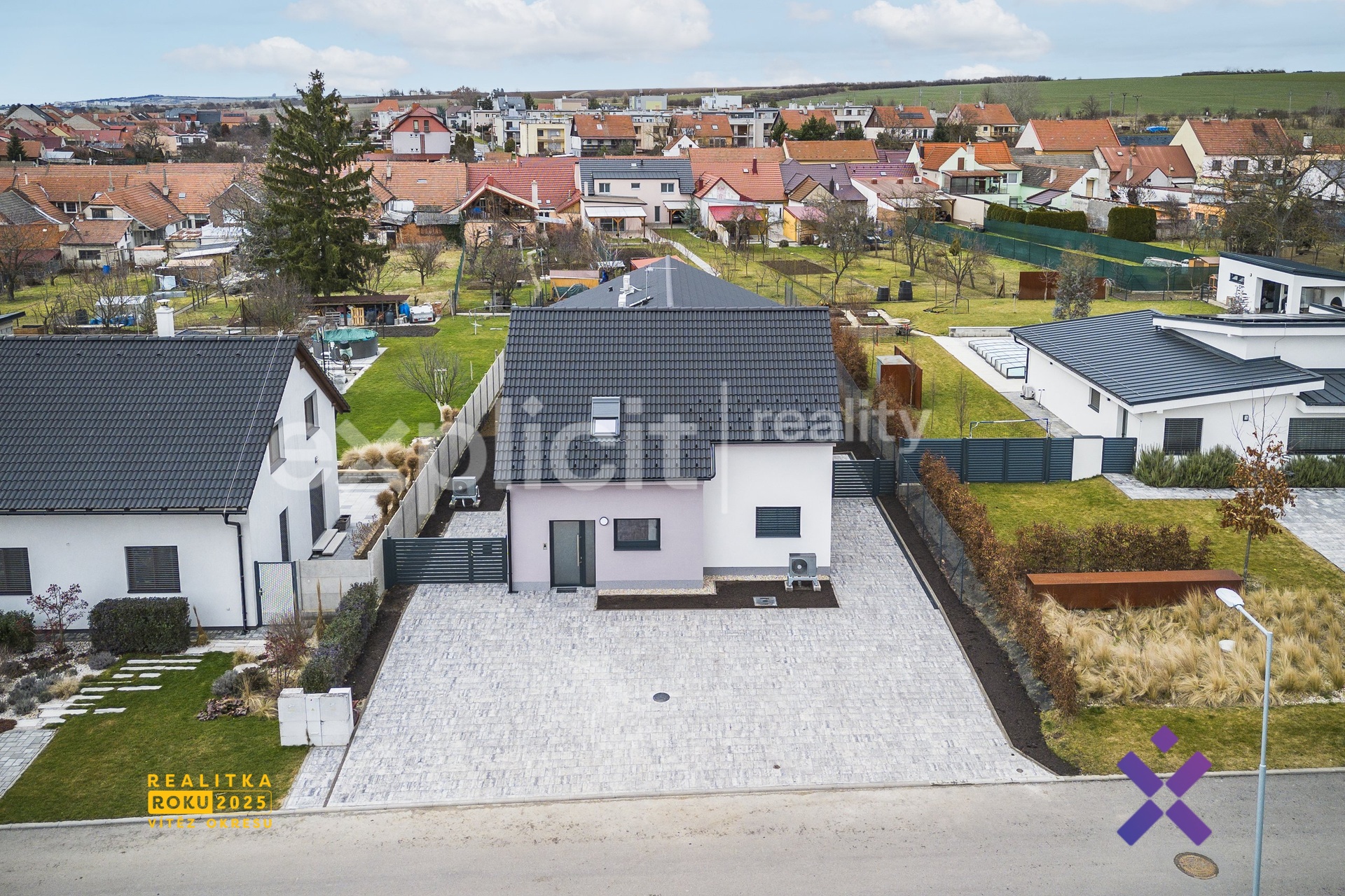 Velkorysá zahrada navazuje přímo na obytný prostor a vytváří přirozené prodloužení interiéru. V létě zde vznikne venkovní obývák, prostor pro děti nebo klidná relaxační zóna pod bioklimatickou pergolou. Moderní cihlová stavba s energetickou třídou B, tepelné čerpadlo, podlahové vytápění, klimatizace i venkovní žaluzie – to vše znamená nejen komfort, ale i nízké provozní náklady a dlouhodobou hodnotu nemovitosti.