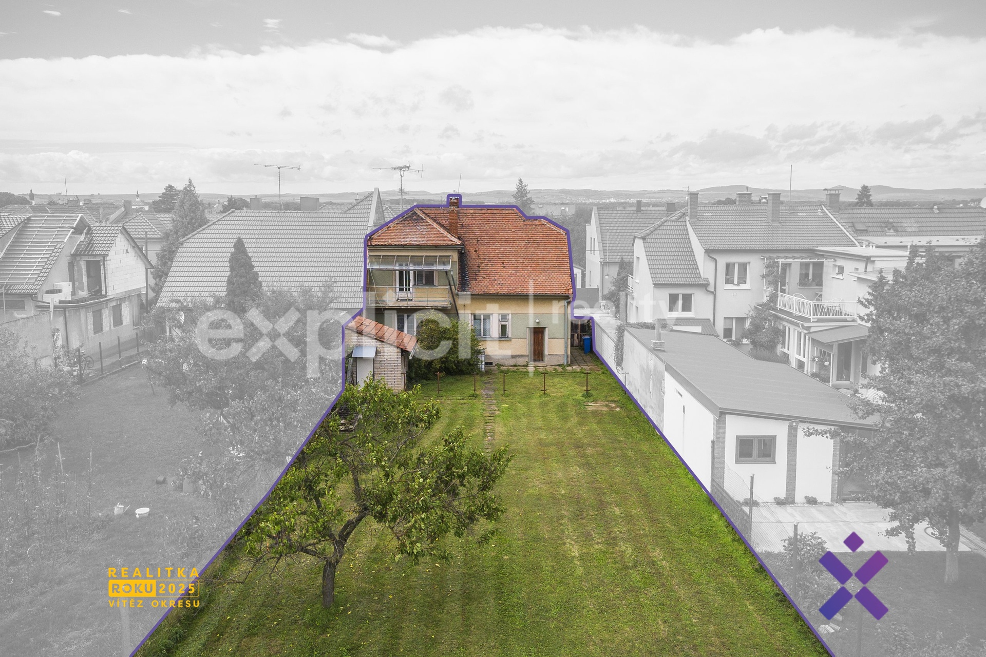 Vizualizace a vyobrazení nemovitosti a pozemku jsou pouze ilustrativní. Závazné údaje o hranicích pozemku jsou uvedeny v katastrální mapě.