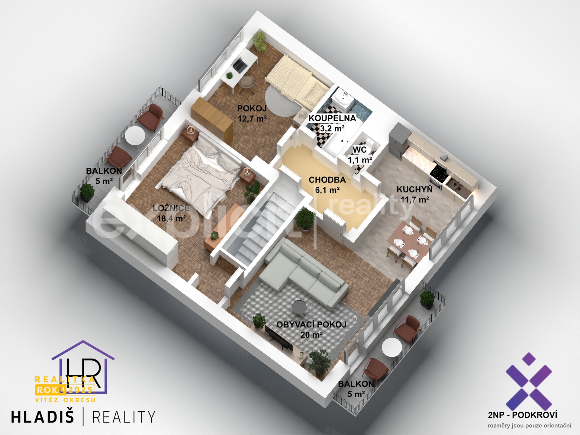 – balkon u ložnice 4,9 m², balkon u obývacího pokoje 4,5 m²