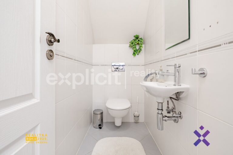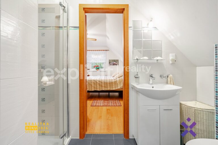 Po vstupu do domu vás přivítá prostorné zádveří, ze kterého je přístup do všech hlavních místností přízemí. Na pravé straně se nachází koupelna se sprchovým koutem, topným žebříkem a oddělenou toaletou. Zajímavostí koupelny jsou dvě skleněná umyvadla a lustr Swarovski. Na levé straně prádelna se sušárnou. Ve vedlejší místnosti je pracovna s koženou sedací soupravou a pracovním stolem, ideální pro práci z domova nebo přijímání hostů. Dále se v přízemí nachází šatna, spíž a technické zázemí, což zajišťuje praktický komfort každodenního života.