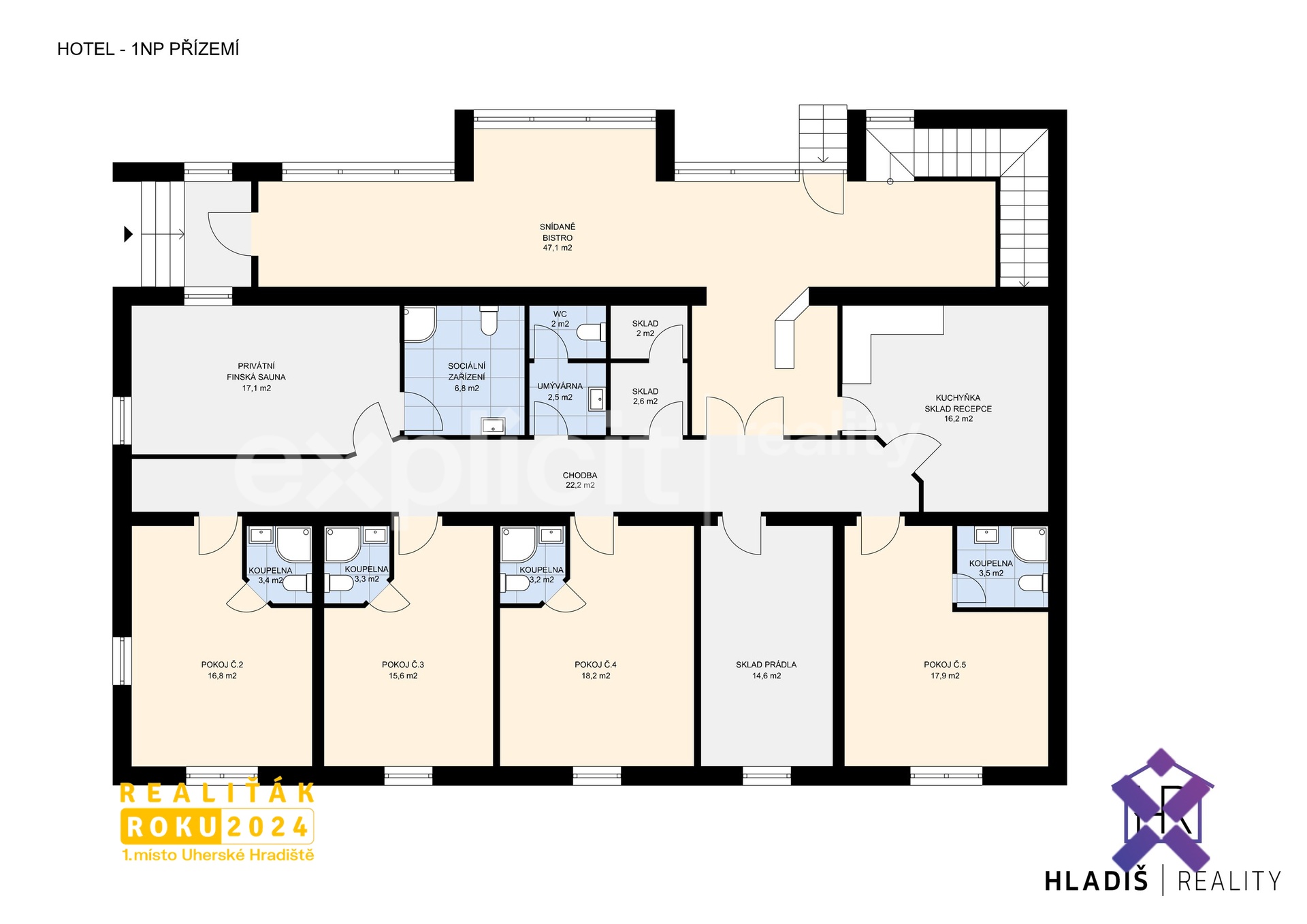 – rekonstrukce pokoje + recepce + bistro (2021), pokoje v 1. patře + finská sauna (2024–2025)