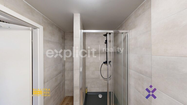 Moderní a čistá koupelna se sprchovým koutem je společně s toaletou sloučena dohromady. Součástí koupelny je topný žebřík a přípojka na pračku.