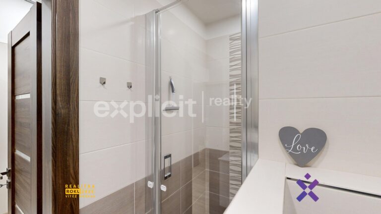 Po levé straně je situována koupelna se sprchovým koutem a topným žebříkem. Koupelna je sloučena s toaletou.