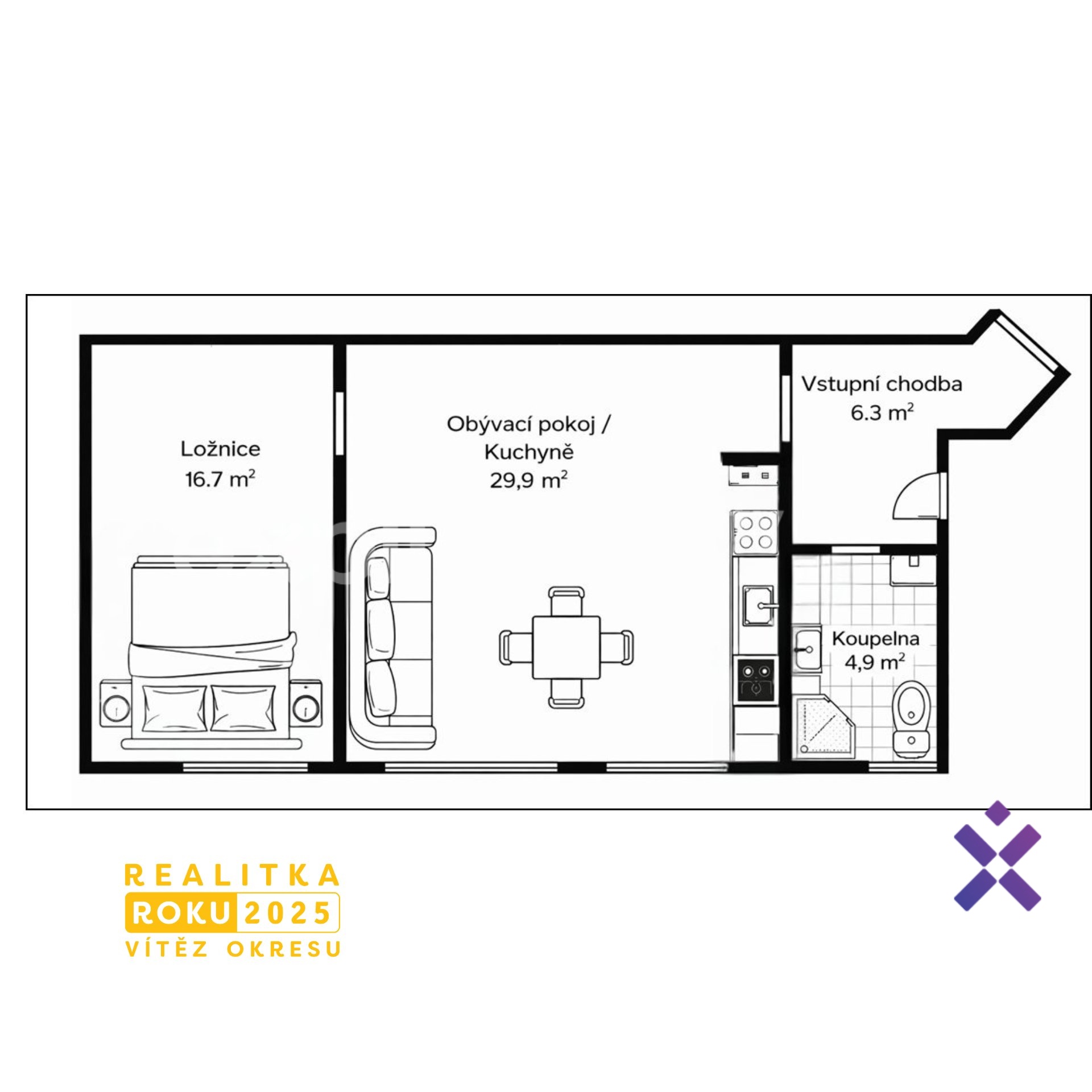 Nabízený byt o dispozici 2+kk má užitnou plochu 57 m² a nachází se ve 2.NP. Je orientován na jihovýchod a balkón přístupný z ložnice nabízí příjemný výhled na obec Ježov.