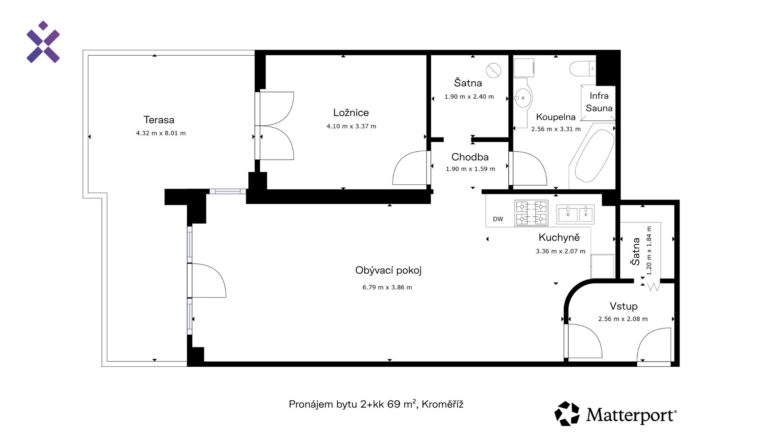 Pronájem prostorného 2+kk s terasou, infrasaunou a možností garáže – Kroměříž, Nitranská