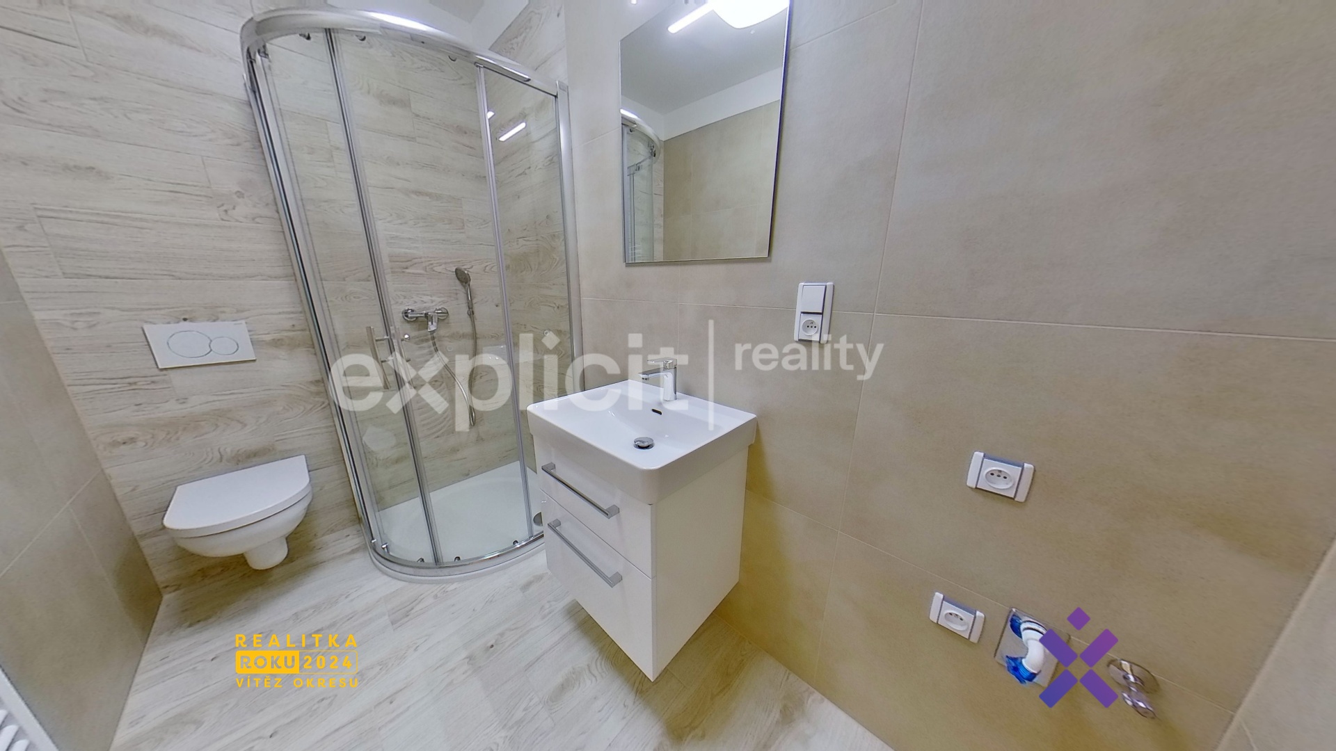V moderní koupelně je sprcha a také příprava pro připojení pračky a sušičky.