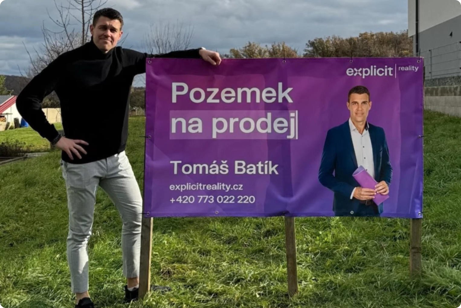 Plachty umísťujeme přímo na nemovitost, aby si jí všimli lidé v okolí. Díky výrazné grafice přitahují pozornost a zvyšují povědomí o prodeji.