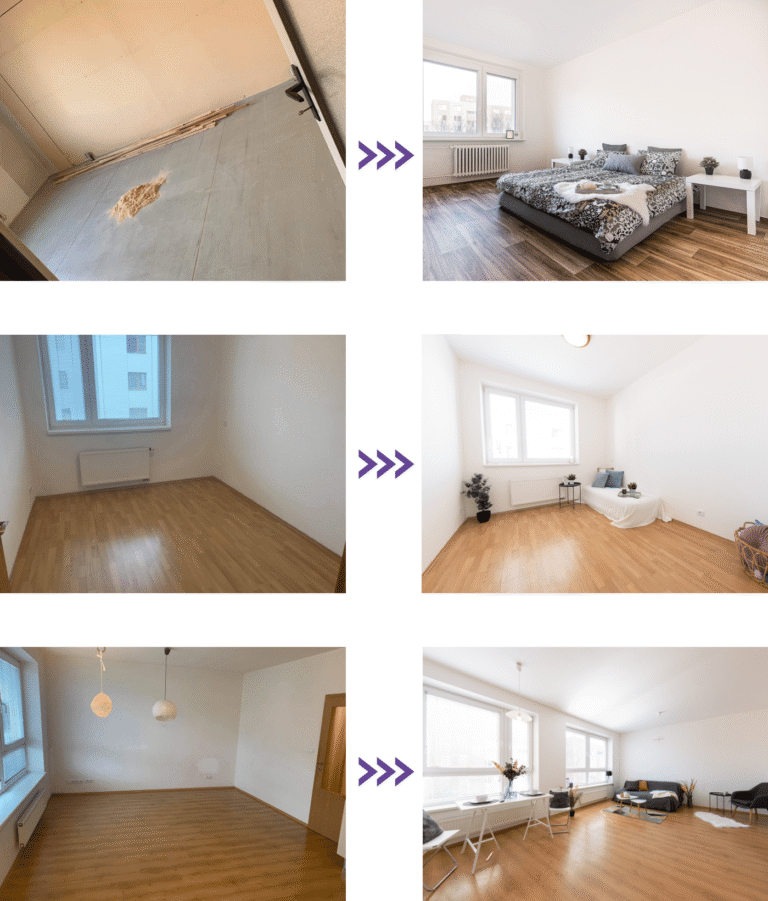 Při prodeji ukážeme kupujícímu potenciál jednotlivých místností. Jen 10% kupců si totiž dokáže obrazně představit, jak můžou prostory vypadat – našim úkolem je inspirovat je. Díky tomu zvýšíme atraktivitu nemovitosti a prodáme ji mnohem rychleji a za co nejlepší možnou cenu, v průměru až o 15% více.